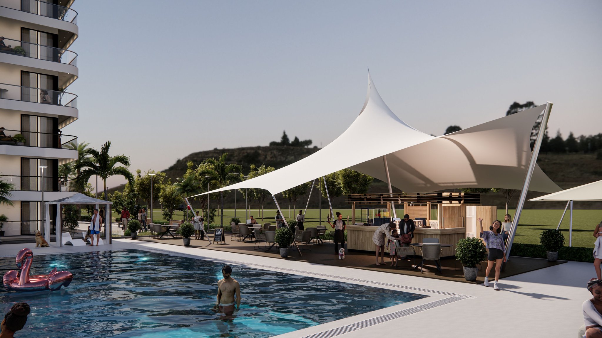 Modern Facilities: Outdoor swimming pool with pool bar, tennis court, open car park, and children’s playground.