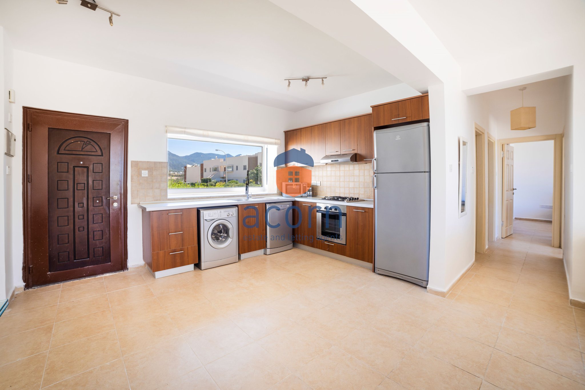 - Bright open-plan living space, kitchen with white goods