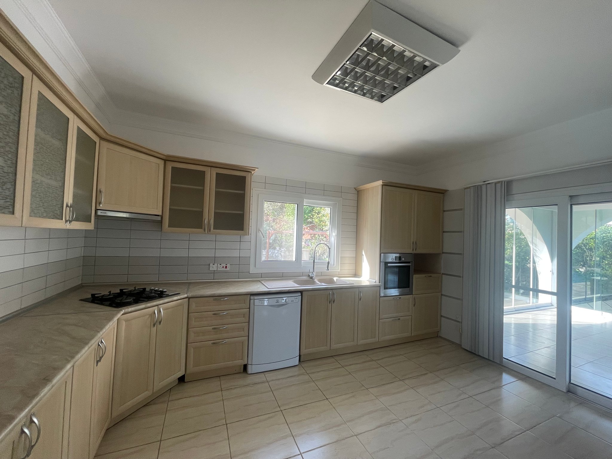 The fully fitted closed kitchen includes a dining area and an additional enclosed sitting space, providing a cosy environment for everyday living. Both the living room and hallway open onto a large terrace overlooking the garden and surrounding landscape.