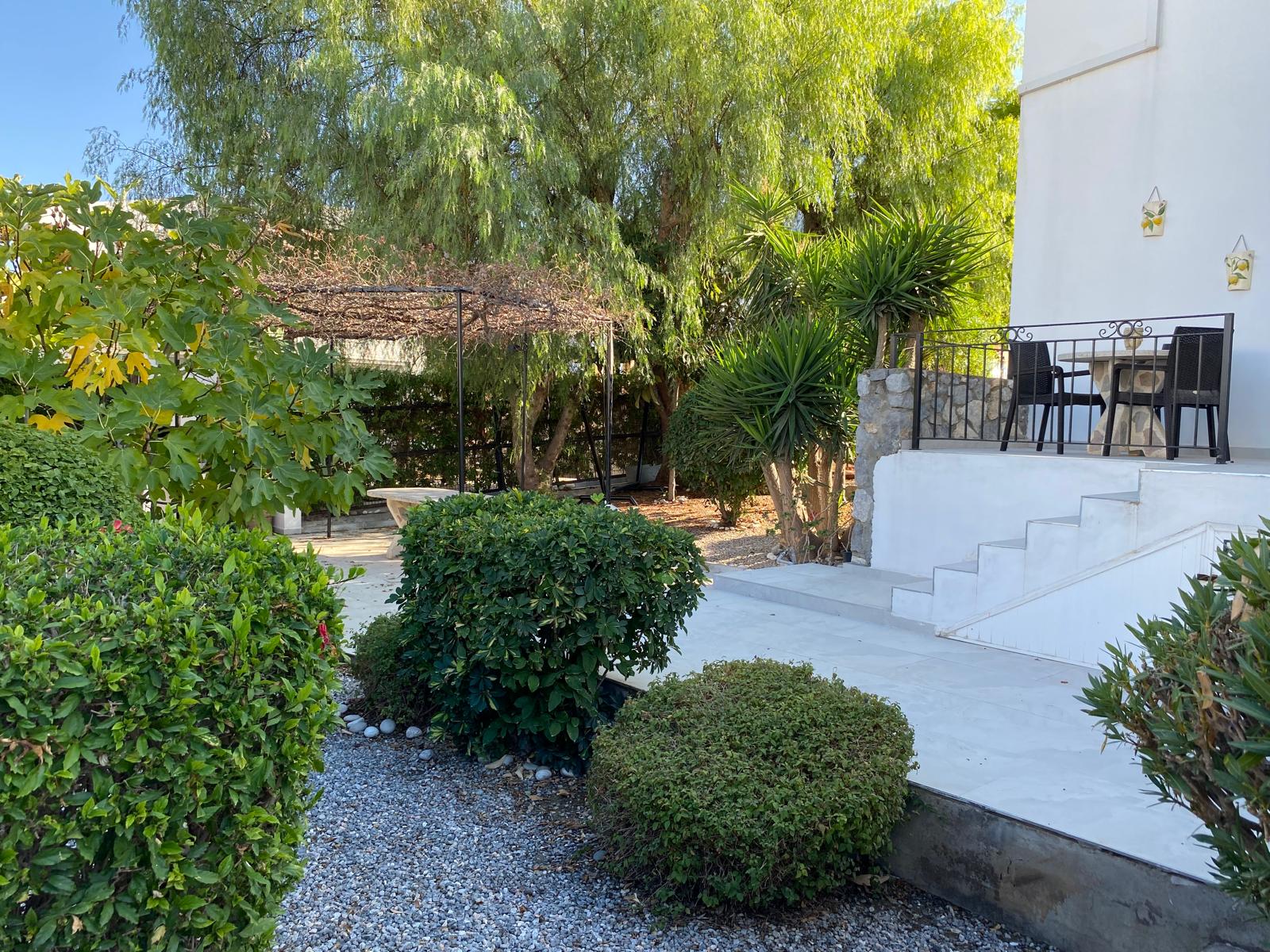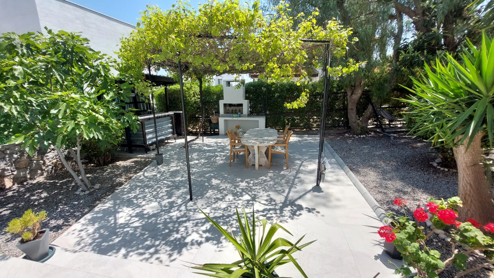 - • Mature 620m² garden with pergola, bar area, and fruit trees (olive, fig, lemon, orange)