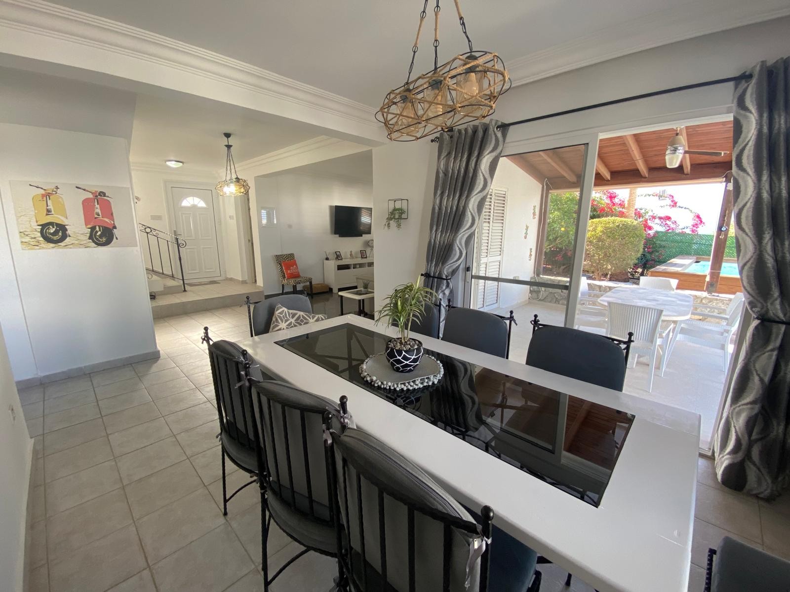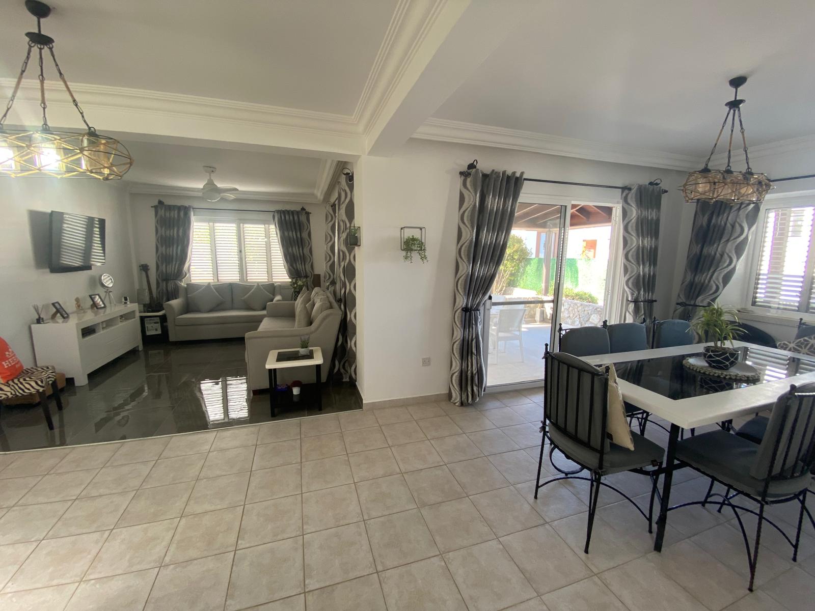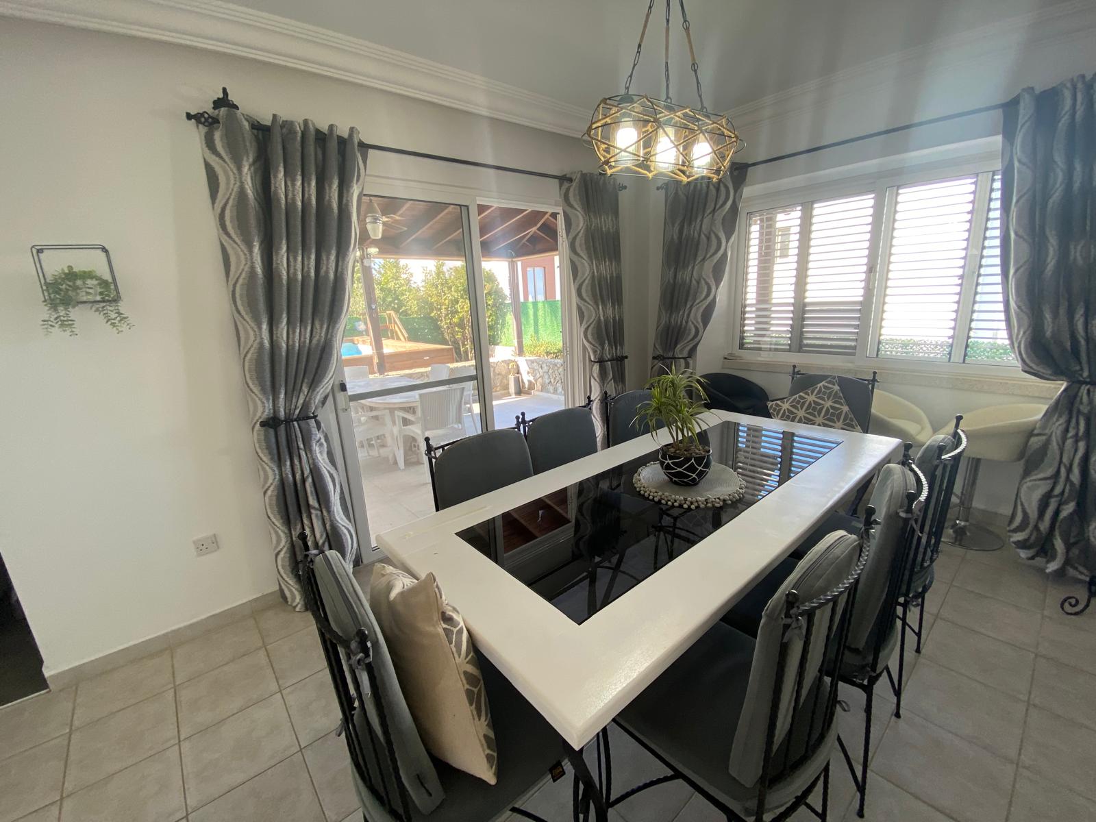 As you enter the property, you are greeted by a bright and welcoming living room on the left, a spacious dining area directly ahead and a separate modern kitchen/breakfast room to the right. The kitchen is fully equipped with white goods, granite work surfaces, and a door leading directly to the garden, making it ideal for outdoor entertaining. The dining area opens onto a generous covered terrace, providing a shaded spot to relax while overlooking the private pool – perfect for al fresco dining and taking in the beautiful surroundings.