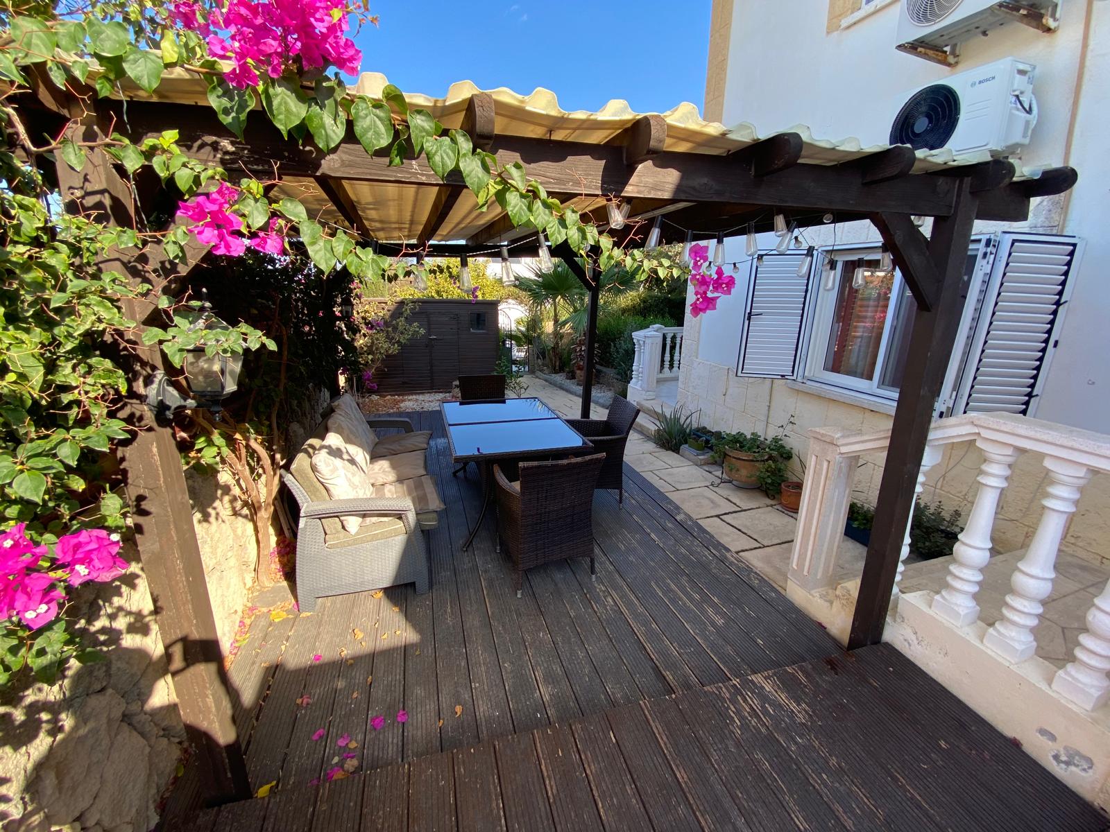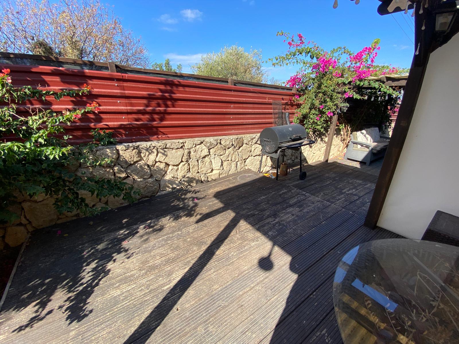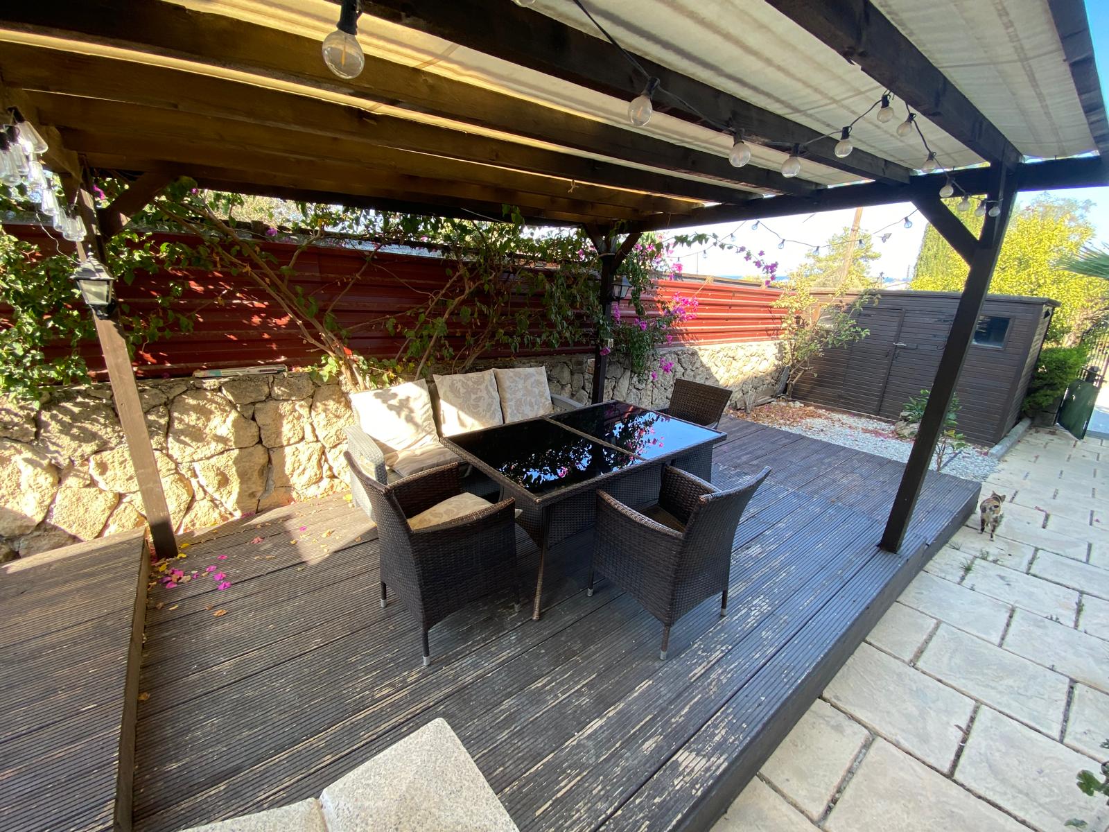 Enjoy a spacious decked area with two covered pergolas—one perfect for dining, the other ideal for morning coffee or evening drinks. The private garden is enclosed by a stone boundary wall and features mature fruit and olive trees (including one over 150 years old), palms, and vibrant bougainvillea.