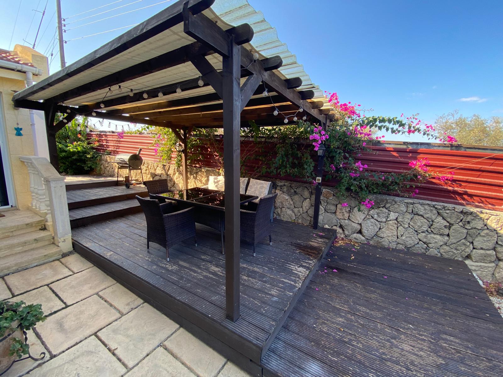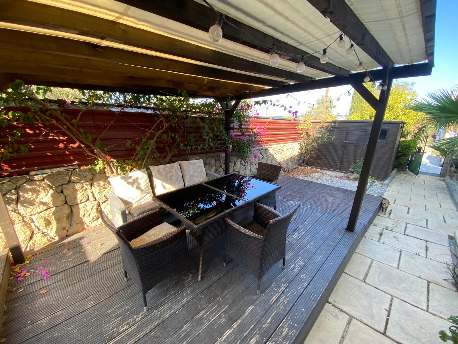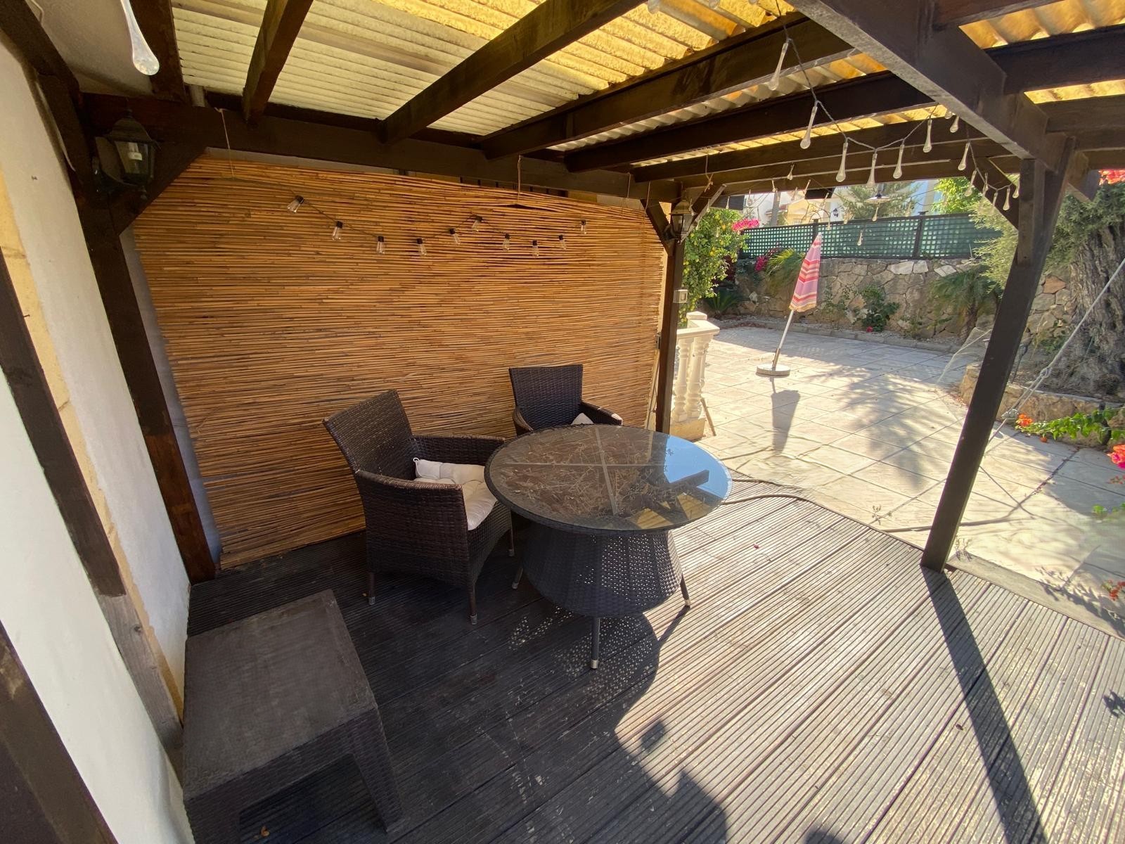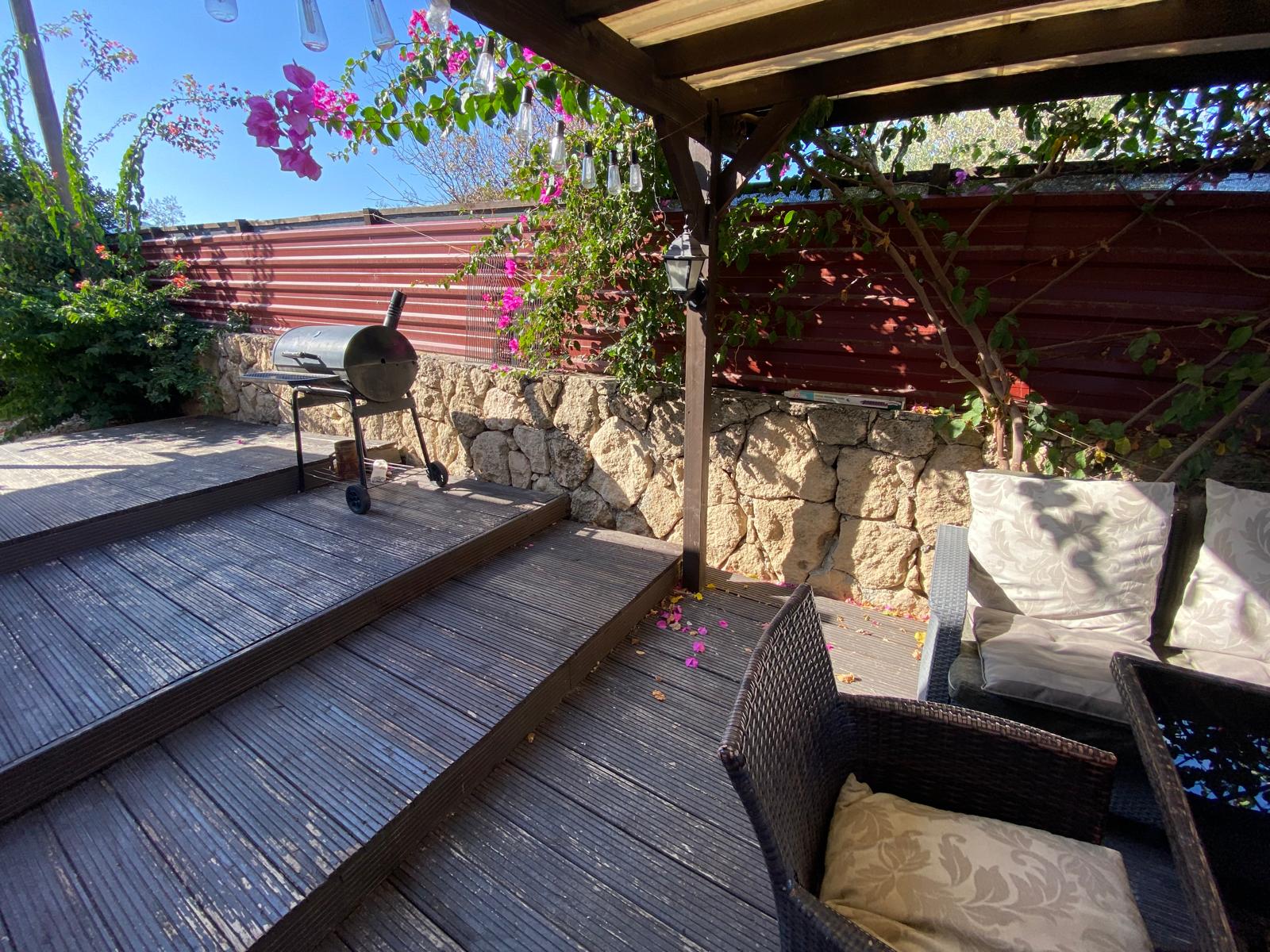 Enjoy a spacious decked area with two covered pergolas—one perfect for dining, the other ideal for morning coffee or evening drinks. The private garden is enclosed by a stone boundary wall and features mature fruit and olive trees (including one over 150 years old), palms, and vibrant bougainvillea.