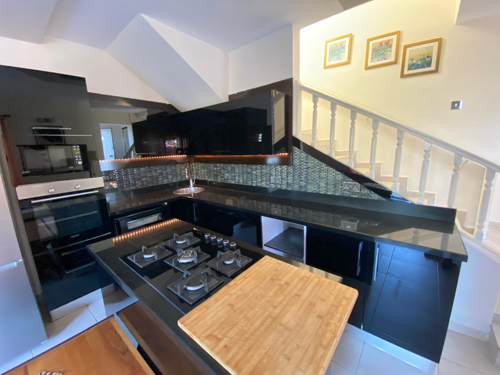 A modern, fully equipped kitchen with granite worktops, a centre island with 5-ring hob, eye-level oven, large fridge freezer and dishwasher (appliances are new)