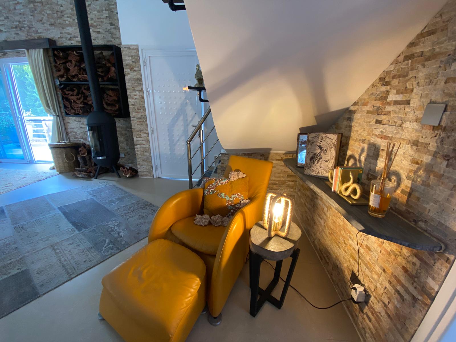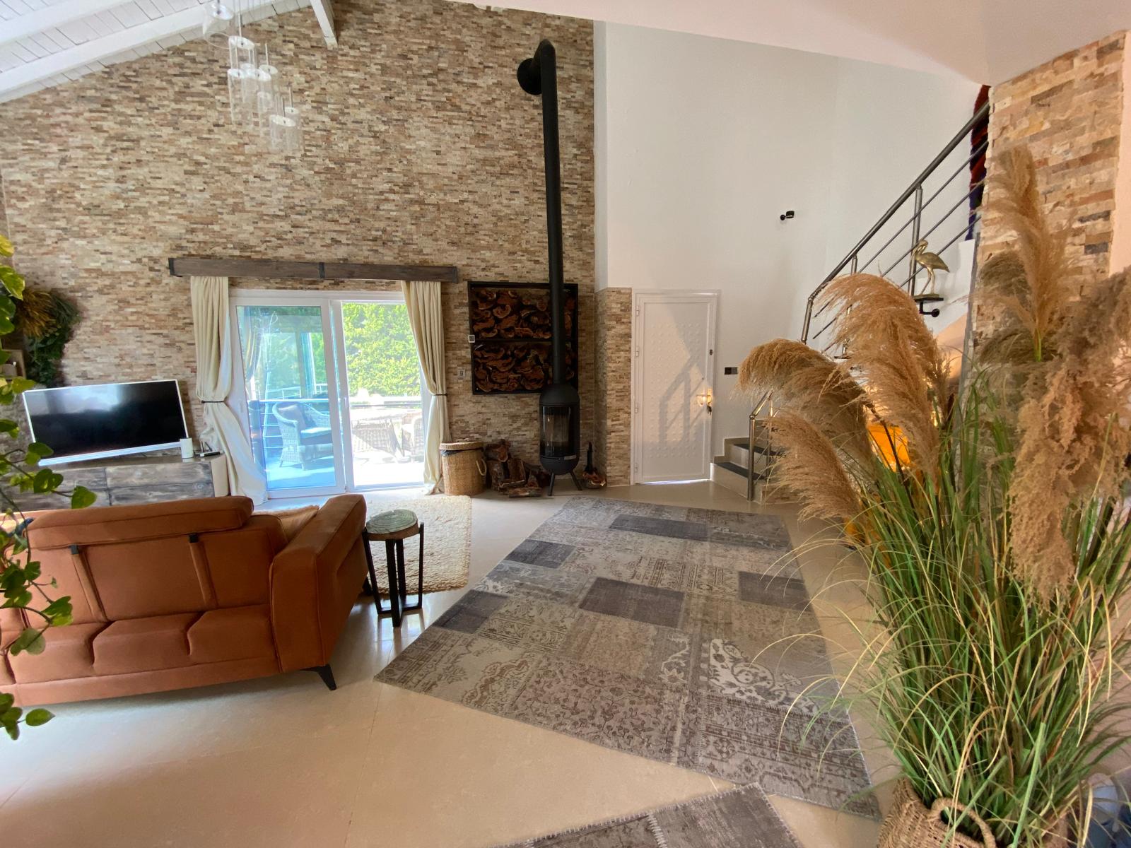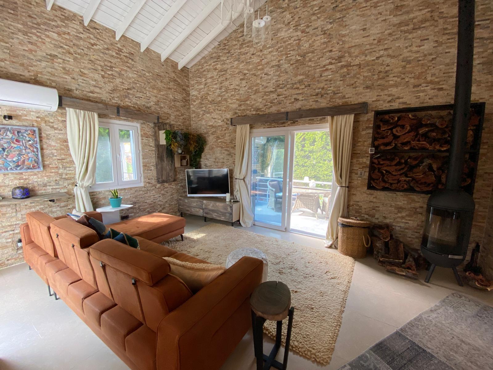 π₯ Charming Living Room: High vaulted beamed ceiling, modern log burner, and patio doors opening onto both front and rear terraces