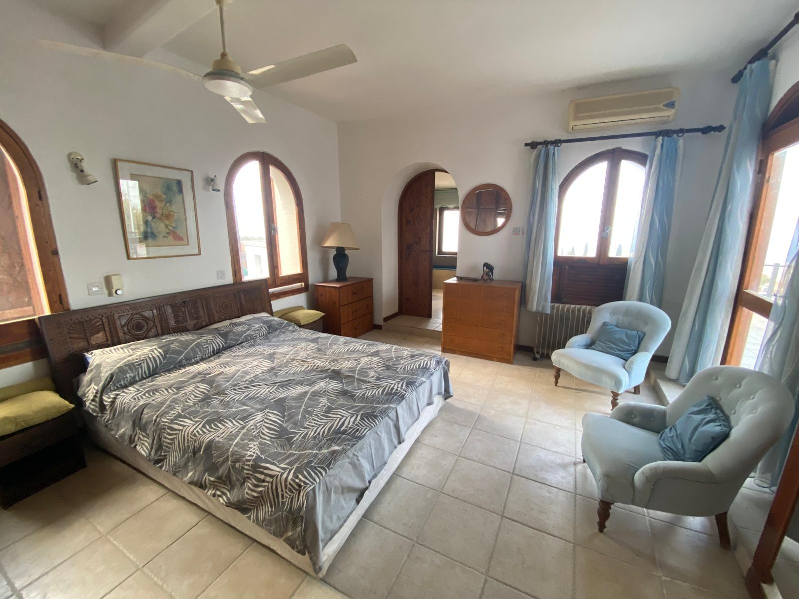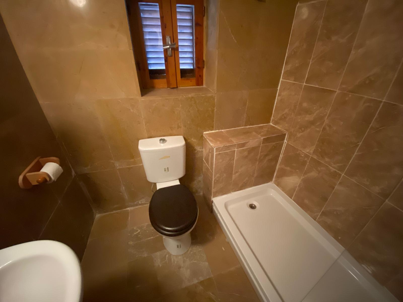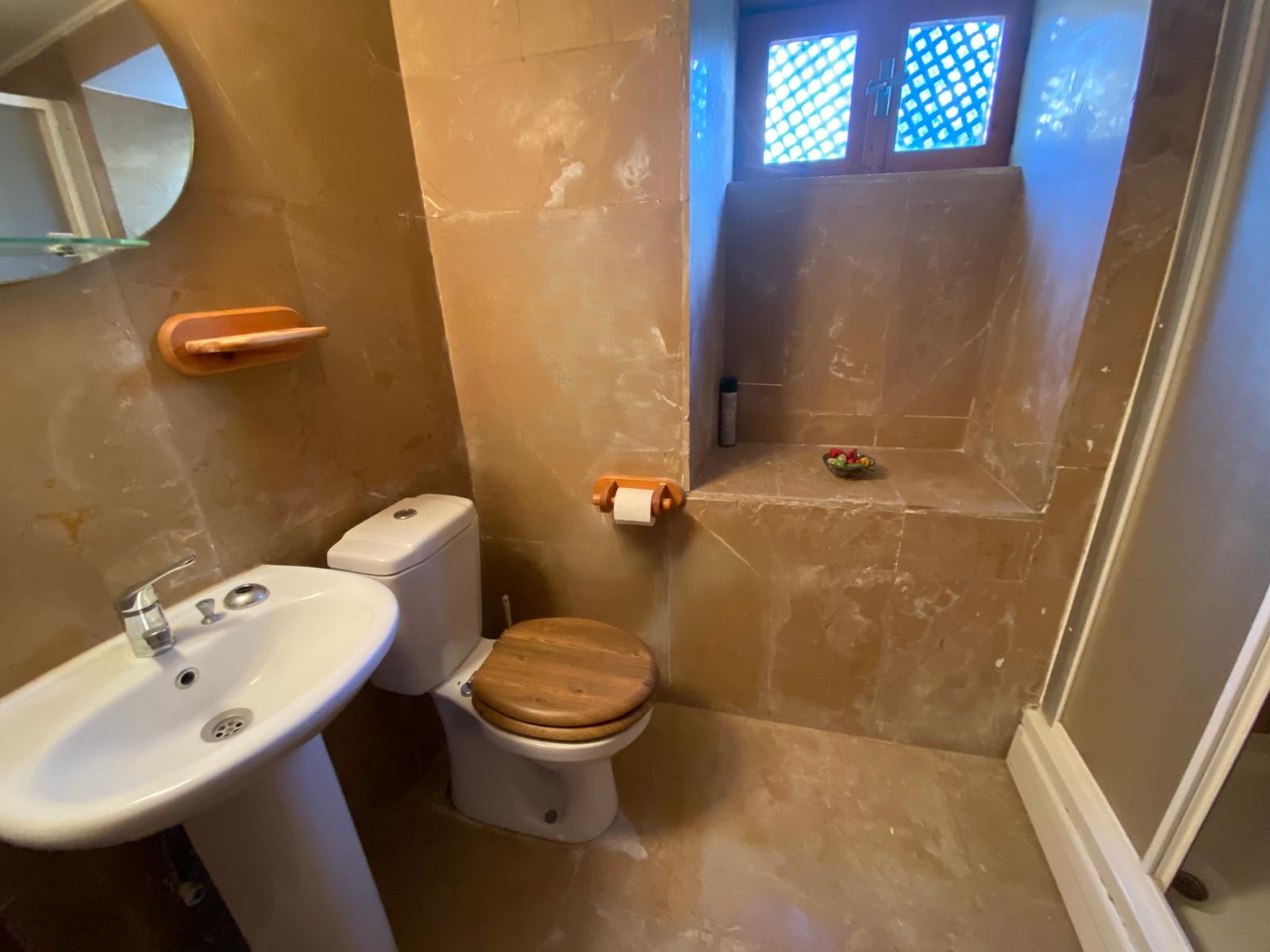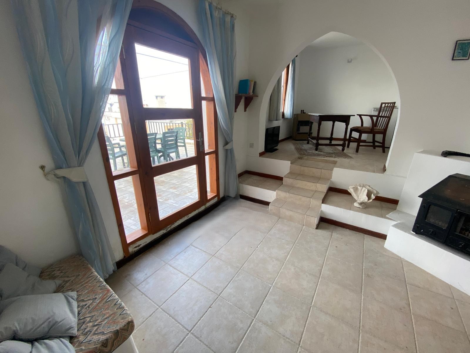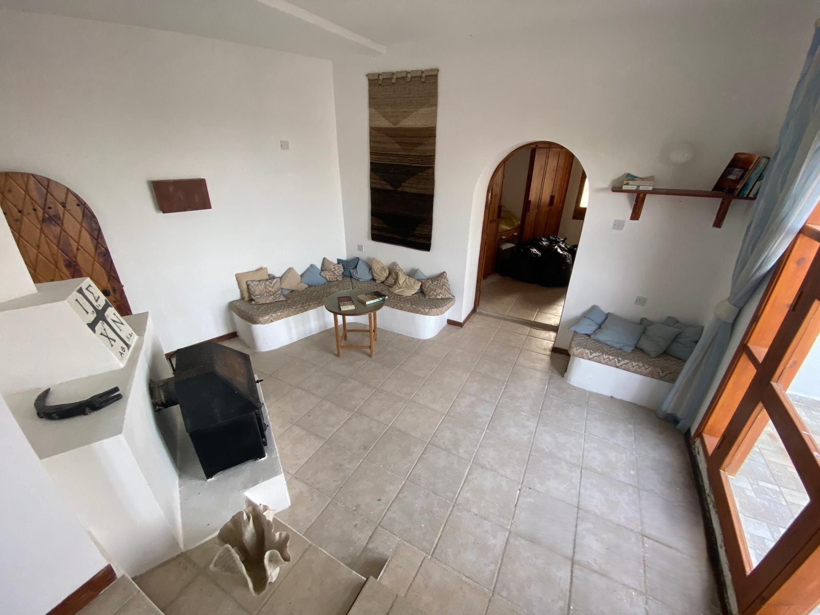 This upper level feels almost like a private apartment. A bright sitting room with log burner opens via patio doors onto the spacious roof terrace, where panoramic views stretch across Bellapais village, the abbey and towards the sea. To one side is an office/dining area — believed to be the very room where Durrell wrote portions of Bitter Lemons, perfectly positioned to overlook the village that inspired him.