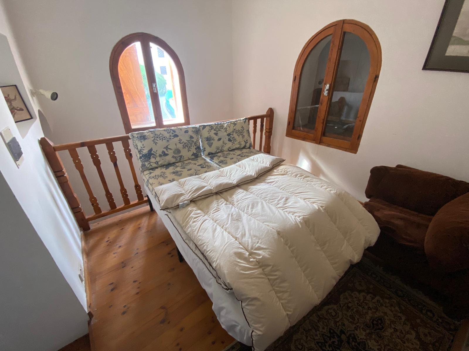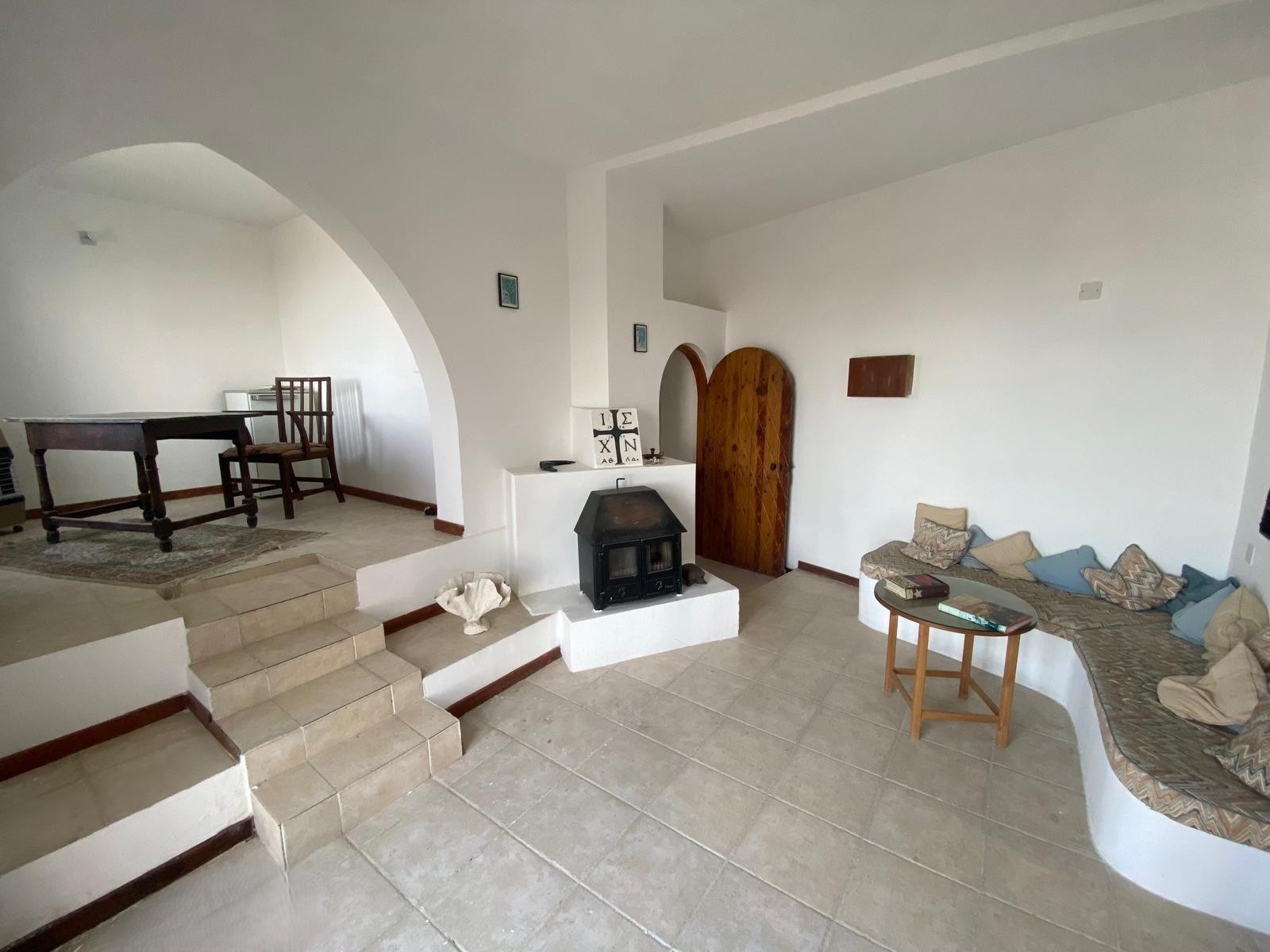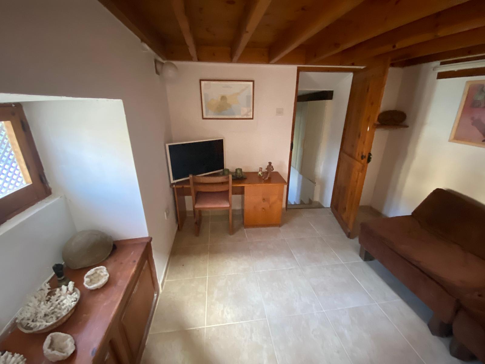 This upper level feels almost like a private apartment. A bright sitting room with log burner opens via patio doors onto the spacious roof terrace, where panoramic views stretch across Bellapais village, the abbey and towards the sea. To one side is an office/dining area — believed to be the very room where Durrell wrote portions of Bitter Lemons, perfectly positioned to overlook the village that inspired him.