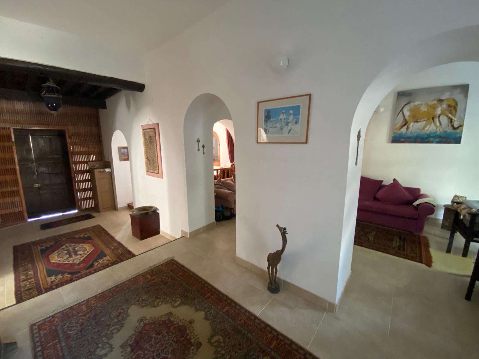 To the left of the hallway, an arch opens into a cosy snug or reading area, which in turn flows through two further arches into the main living room. Patio doors from both the hallway and the living room open directly into the courtyard garden, creating an indoor-outdoor Mediterranean lifestyle.
